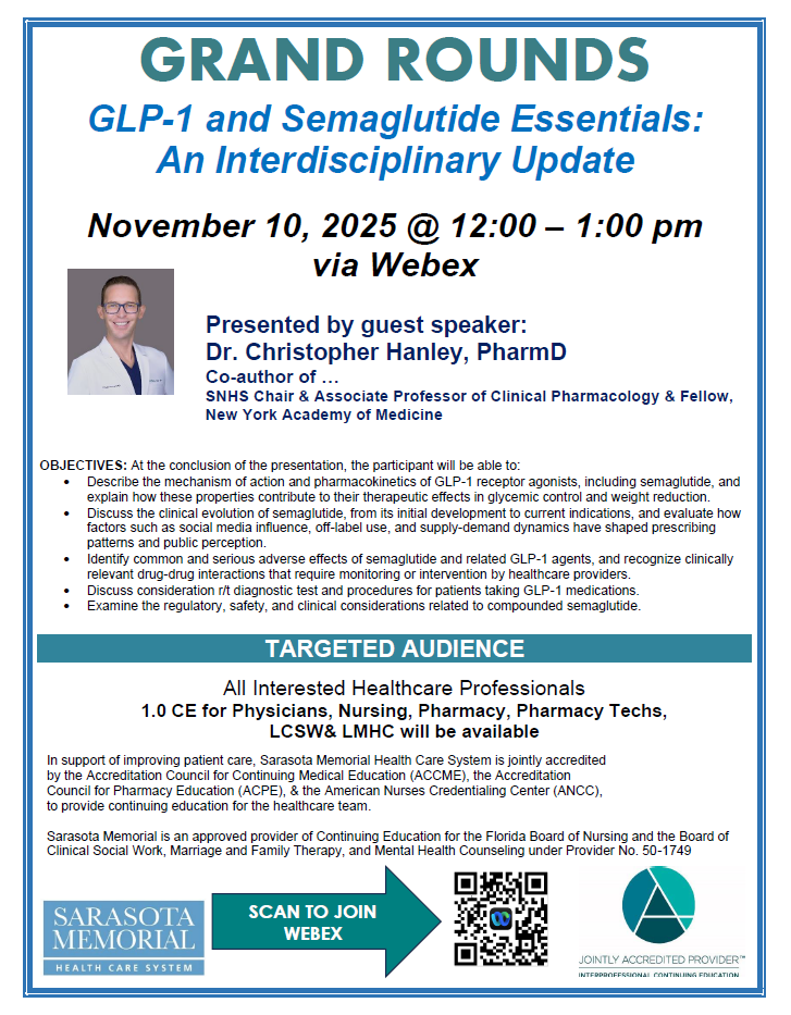 GRAND ROUNDS: GLP-1s and Semaglutide, Dr. C. Hanley, PharmD presenting